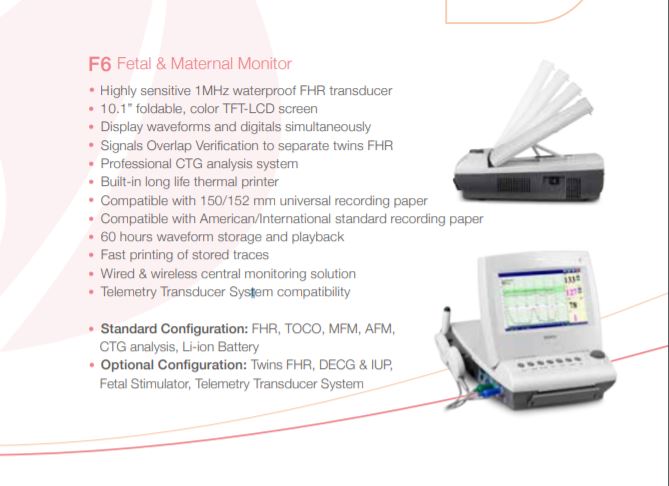 Highly sensitive 1MHz waterproof FHR transducer ● 10.1” foldable, color TFT-LCD screen ● Display waveforms and digitals simultaneously ● Signals Overlap Verification to separate twins FHR ● Professional CTG analysis system ● Built-in long life thermal printer ● Compatible with 150/152 mm universal recording paper ● Compatible with American/International standard recording paper ● 60 hours waveform storage and playback ● Fast printing of stored traces ● Wired & wireless central monitoring solution ● Telemetry Transducer System compatibility ● Standard Configuration: FHR, TOCO, MFM, AFM, CTG analysis, Li-ion Battery ● Optional Configuration: Twins FHR, DECG & IUP, Fetal Stimulator, Telemetry Transducer System F